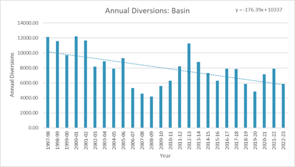 There has been a significant decline in water usage in the Basin. Diversions in the Basin have, at most times, halved from pre-Plan levels.