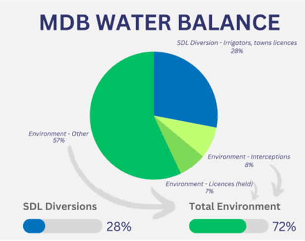 Following the Basin Plan, just 28% of the total water balance is diverted, with 72% for the environment.